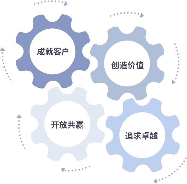 成就客户是一切决策的出发点,,创造价值是衡量所有工作的标准,,,,追求卓越是我们做事做人的态度,,开放共赢是我们的格局也是最终的结果。。。。价值观的齿轮环环相扣,,推动着组织里的每个人不断向前。。。